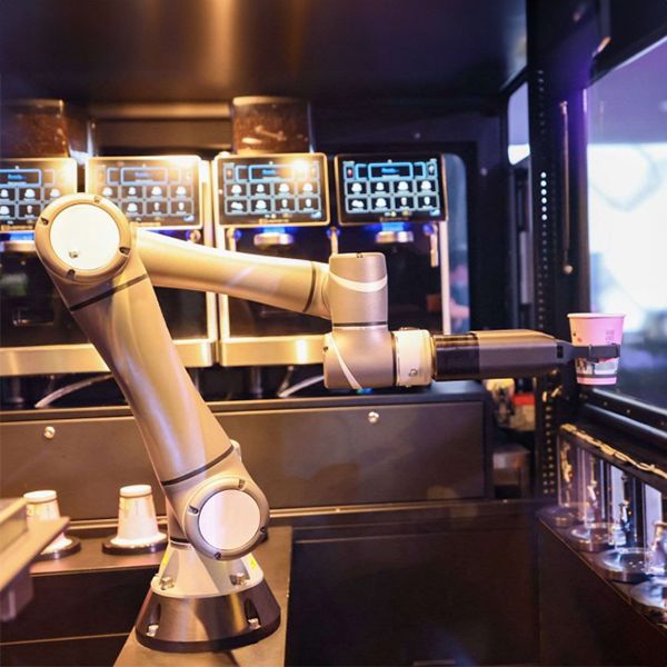 This Robot Barista serves a selection of Flat Whites, Cappuccinos, Americanos, and Lattes, with optional syrups like caramel and vanilla.