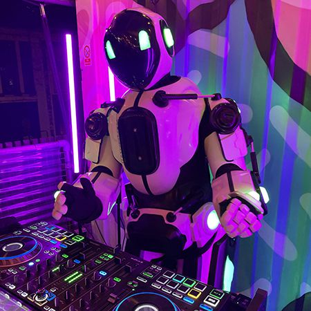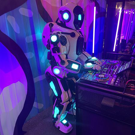 Prepare to be dazzled by our futuristic robot DJ, delivering a high-tech show with stunning LED lights, impressive robot dances, and sleek modern design.