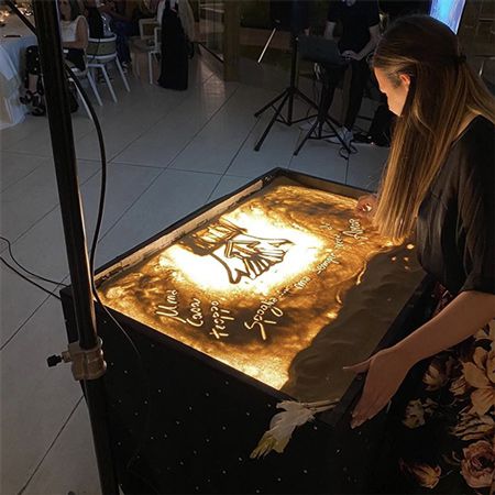 Our skilled female sand artist has an exceptional talent for swiftly transforming sand into dynamic figures and captivating stories.