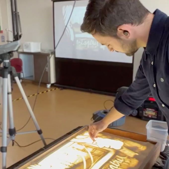 Our artist crafts stunning animated themed stories by drawing scenes entirely with sand within the video.