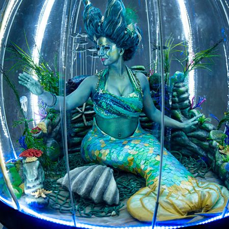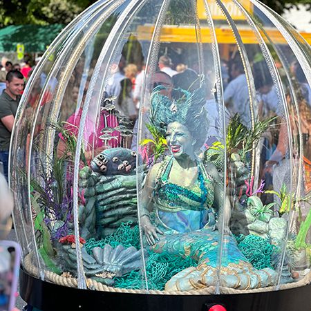 Filled with aquatic wonder and mesmerizing charm, this sea siren navigates your event space within her dome. Not just a daytime attraction, the entire globe is also beautifully self-illuminated, creating an especially magical spectacle at night. This enchanting and unique roaming entertainment will captivate audiences of all ages, leaving them mesmerized by the magical experience.