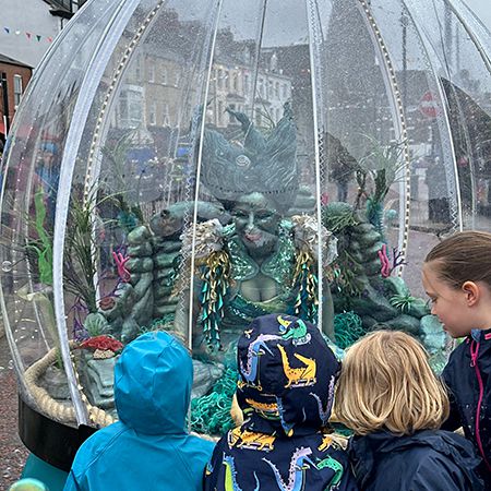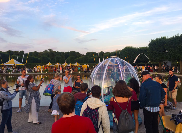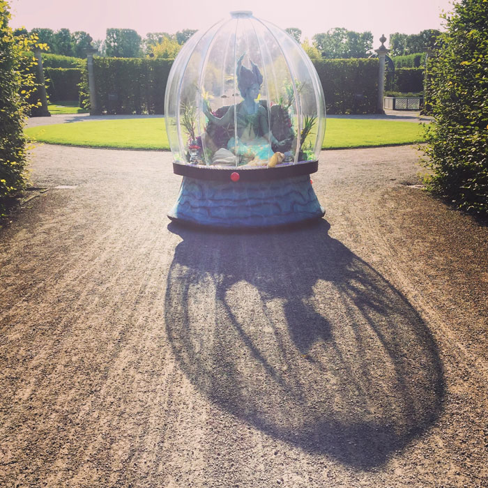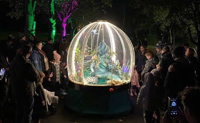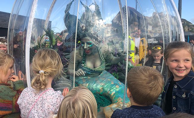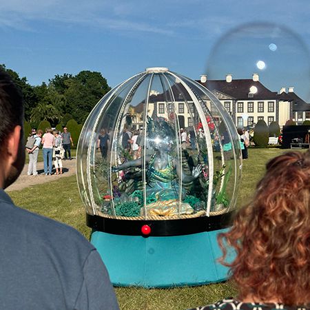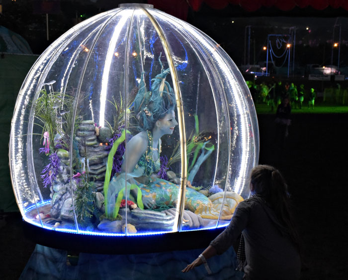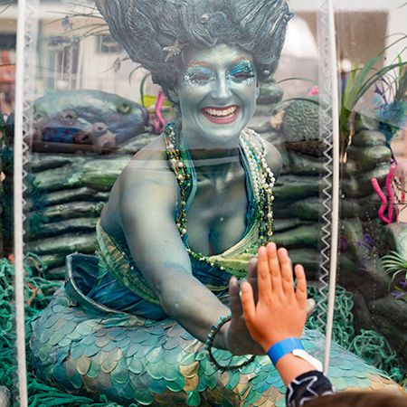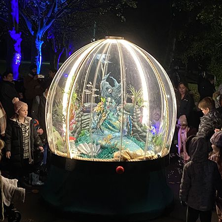 Guests are quickly drawn to the roaming sea globe, soon gathering around for a closer look. Gentle, atmospheric music plays from the Sea Globe, and a variety of nautical sound effects are triggered by a sweep of the mermaid's hand, surprising and delighting spectators. The mermaid loves to interact with guests, reaching out to touch hands through the sphere and gently flapping her tail. A big red button on the front of the globe can be pressed by anyone, releasing bubbles into the audience and causing the marvelous seaweed around her to sway.