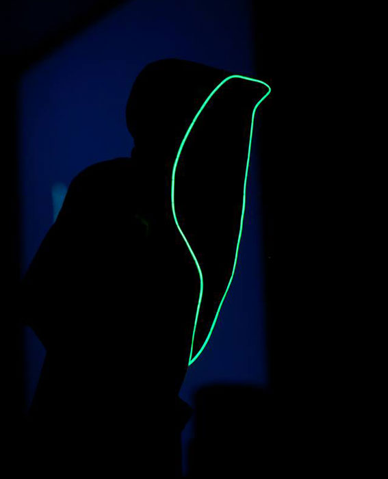 Our enigmatic hooded event artist delivers a mesmerizing experience for your guests, guaranteed to seize their attention. Audiences will be amazed by the glow art that emerges from the darkness as neon scenes reveal themselves right before their eyes. Images appear and then fade away as the artist begins new sequences, resulting in an ever-changing and evolving storyboard.