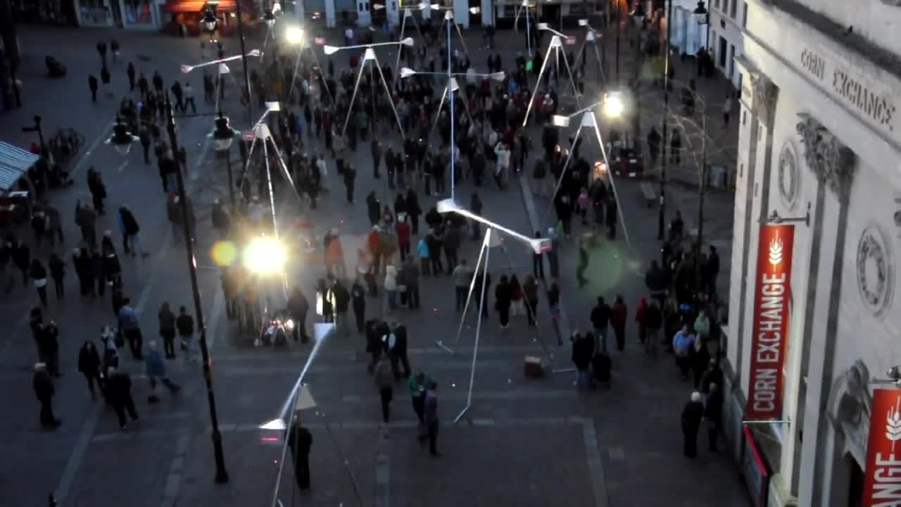 The large metal tripods support rotating arms equipped with loudspeakers and LED lights at their ends, creating a mesmerizing combination of sound and light.