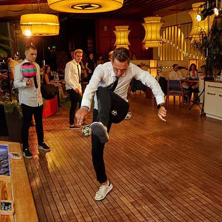 This choreographed sports freestyle performance can showcase captivating football, basketball, and footbag tricks to impress your guests.