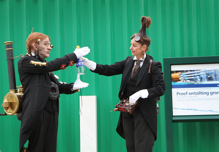 The walkabout character was created by a highly inventive couple from the Netherlands, with over 25 years of experience as roaming characters. This unique act is among the first in the world to use flexible silicone masks, similar to those in movies. The result is an astonishingly realistic man-machine creation that captivates audiences, compelling them to watch and record the performance.