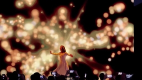 Highly captivating, our dancer interacts with the screen's visuals, becoming enveloped in golden stardust as she gracefully moves with the star behind her.