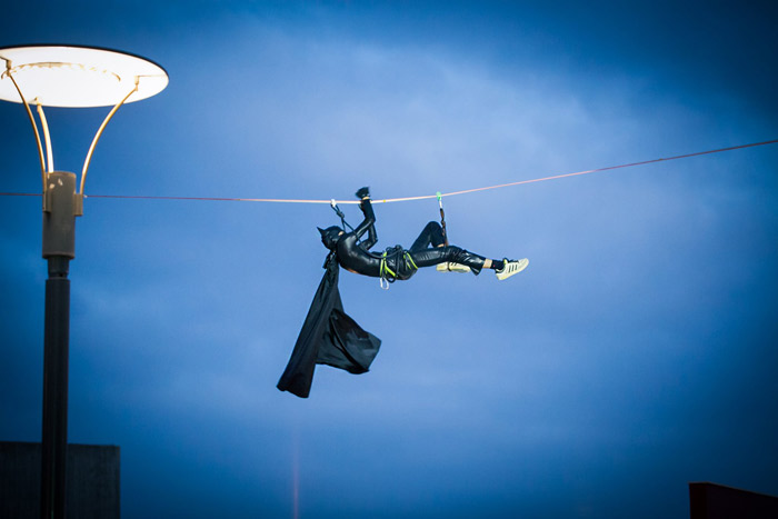 Can be themed and customized, and he can perform anywhere he can secure his rope, such as shopping centers, between buildings, and more.