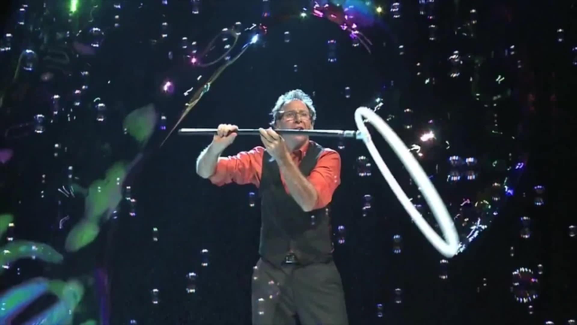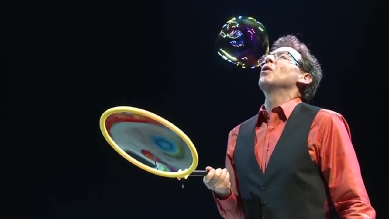 His thrilling shows feature a variety of astonishing bubble tricks, such as people inside bubbles and square bubbles. He also incorporates shaped bubbles into several interactive activities, including bubble brains, trampoline bubbles, trumpet bubbles, and William Tell bubbles. In addition to his classic bubble show, he offers educational performances, using bubbles as a medium to skillfully explain physics, chemistry, geometry, and aerodynamics to children and students. A natural comedian, even his educational shows are delightfully humorous.