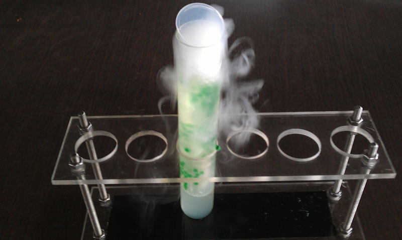 At The Lab, bartenders use measuring cylinders, pipettes, Petri dishes, flasks, and dry ice to create the effect of a blue illuminated bar, emulating that of a laboratory.