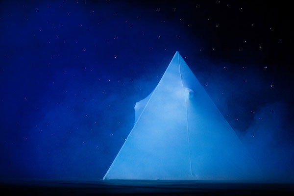 A white pyramid, with or without logo projection, rises on stage... With the first beats of music, the performance comes alive through lasers and silhouettes inside the pyramid... The pyramid's unveiling and the choreographed movement of laser highlights introduce a unique juggling act, where human skill, technology, and precision harmonize perfectly!