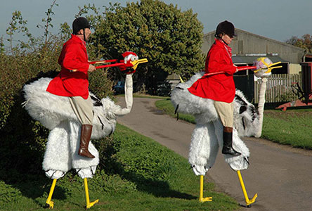 Another highly original concept, our ostriches and their stylish riders offer amusing and engaging costume characters. Donning black riding hats and scarlet red jackets, our ostrich trainers attempt to manage their spirited birds as they run around, playfully pecking at passersby.