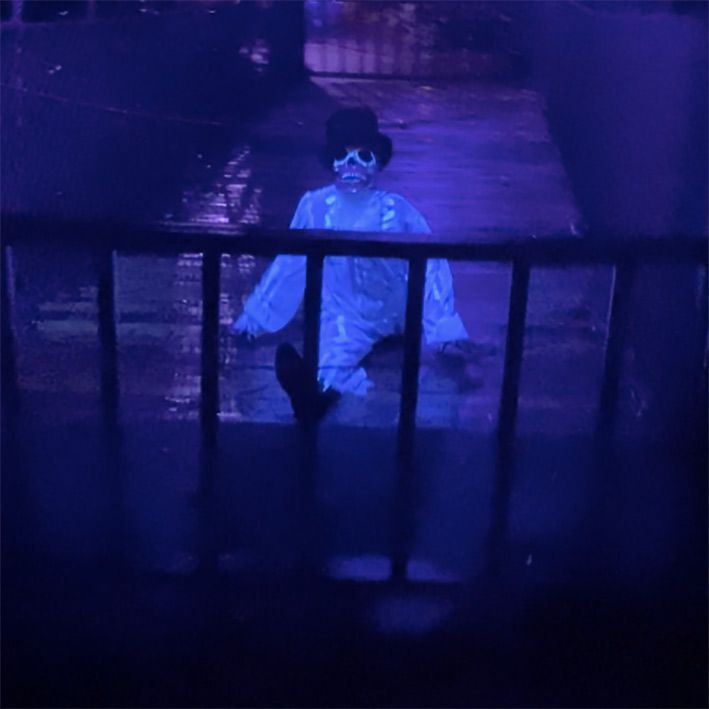 Under a UV light, our playful skeleton's bones will emit an eerie glow, enhancing the spookiness of her performance.