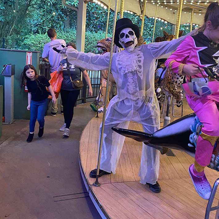 Our eerie contortionist engages with guests of all ages, gracefully dancing, bending her body into incredible shapes, and posing for photos.