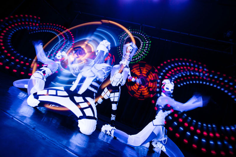 Explore our Black Light Show for a LED act performed in complete darkness, or check out our Pyro Show and Fireshow for outstanding fire performances.