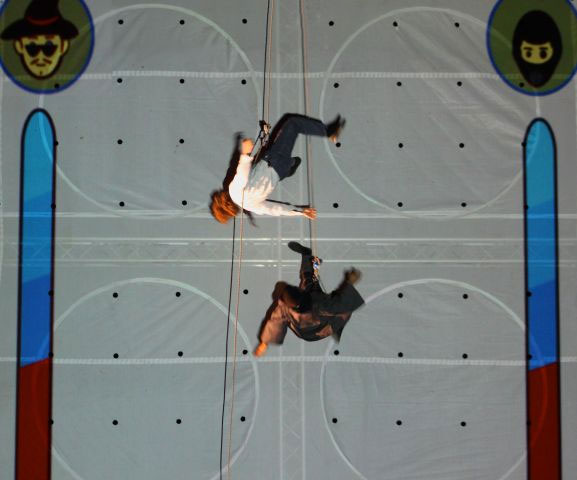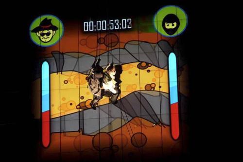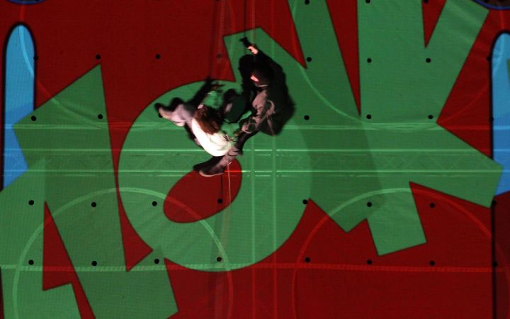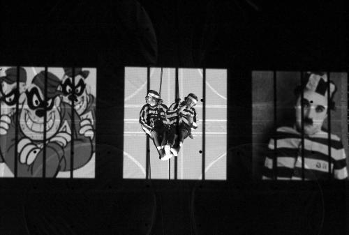 Drama, video sets, and physical elements merge in a visual comedy show where 2D projections blend with 3D acrobats and actors, creating a uniquely captivating effect. The two protagonists embark on an adventurous journey, caught between the mythical world of comics and animated films and the pseudo-reality of a computer projecting the images.