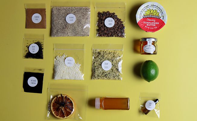 50ml tequila, lime, sugar, black lava salt, activated charcoal powder, dried orange slice. Truffle ingredients: almond flour, pumpkin spice, cacao powder, nut/seed butter, cacao nibs, coconut, honey and hemp seeds, plus a printed recipe. Kits can be shipped within the USA.