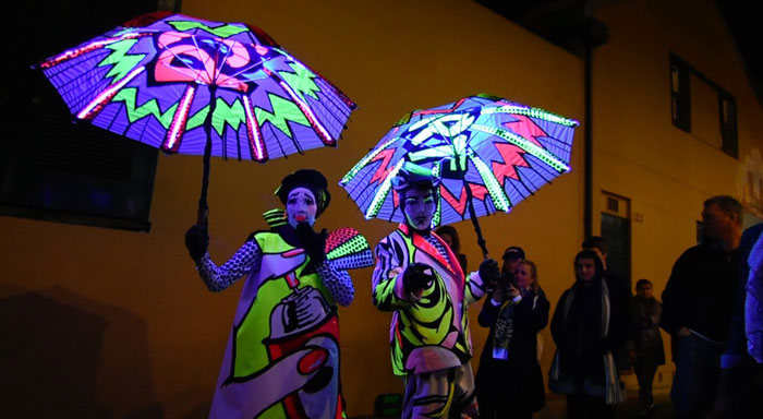 The visually striking walkabout neon Pop Art duo features eye-catching fluorescent costumes inspired by the iconic works of pioneering American Pop artist Roy Lichtenstein. These bright neon costumes are illuminated by cleverly integrated lighting strips built into the duo’s umbrellas. This makes the stunning costumes stand out in any setting, especially in darker environments. Our walkabout neon Pop Art duo becomes the focal point wherever they go, ensuring they will be the most talked-about act at your event.