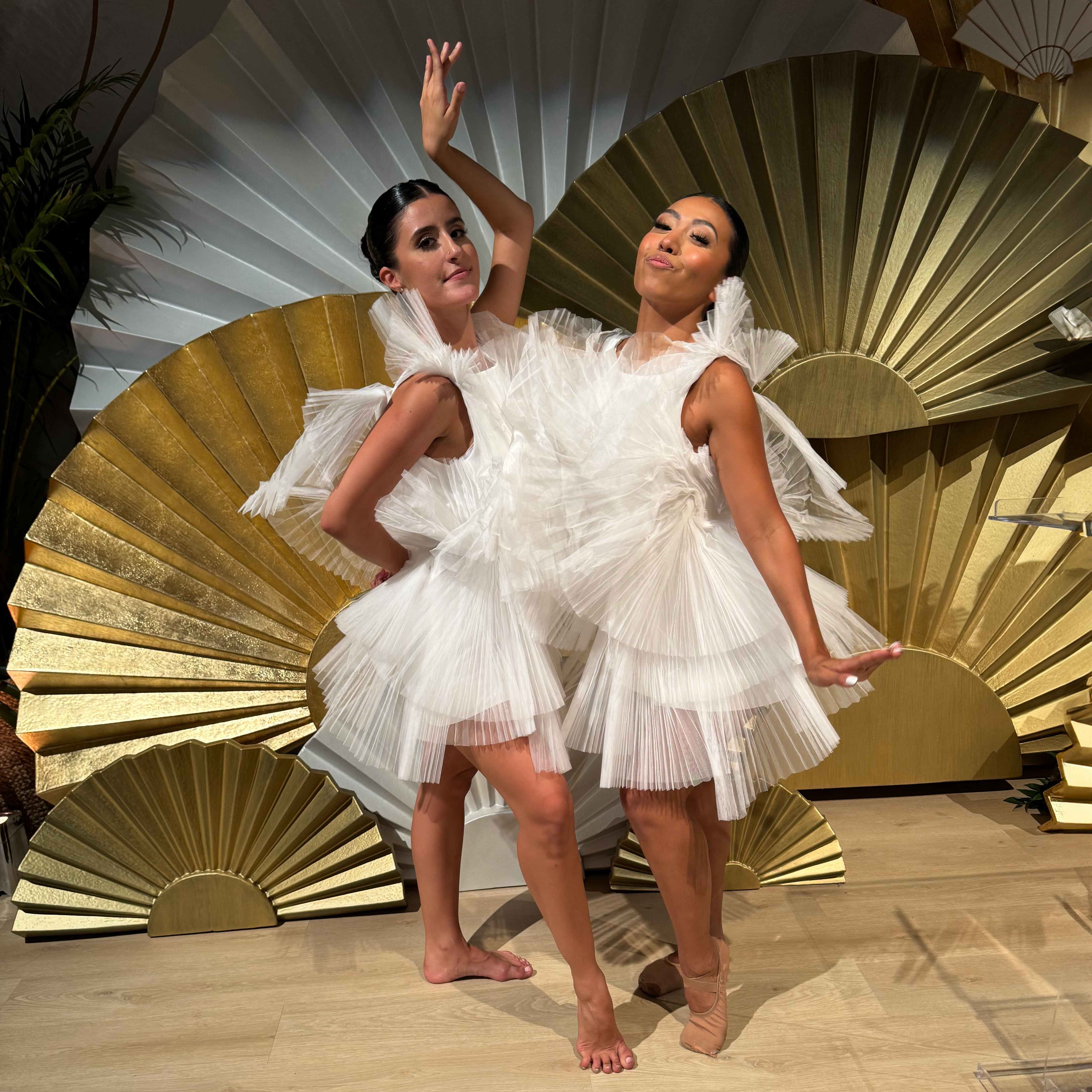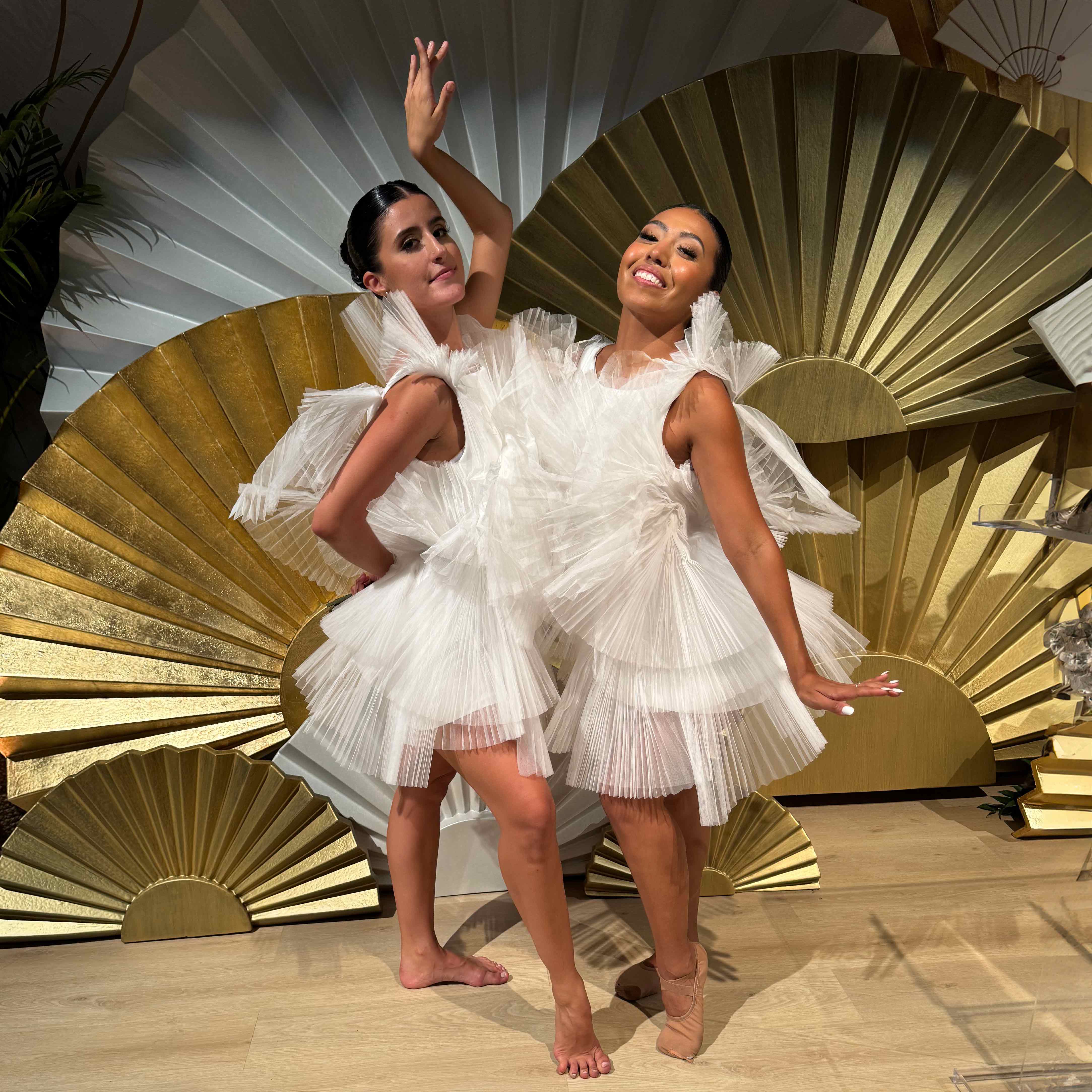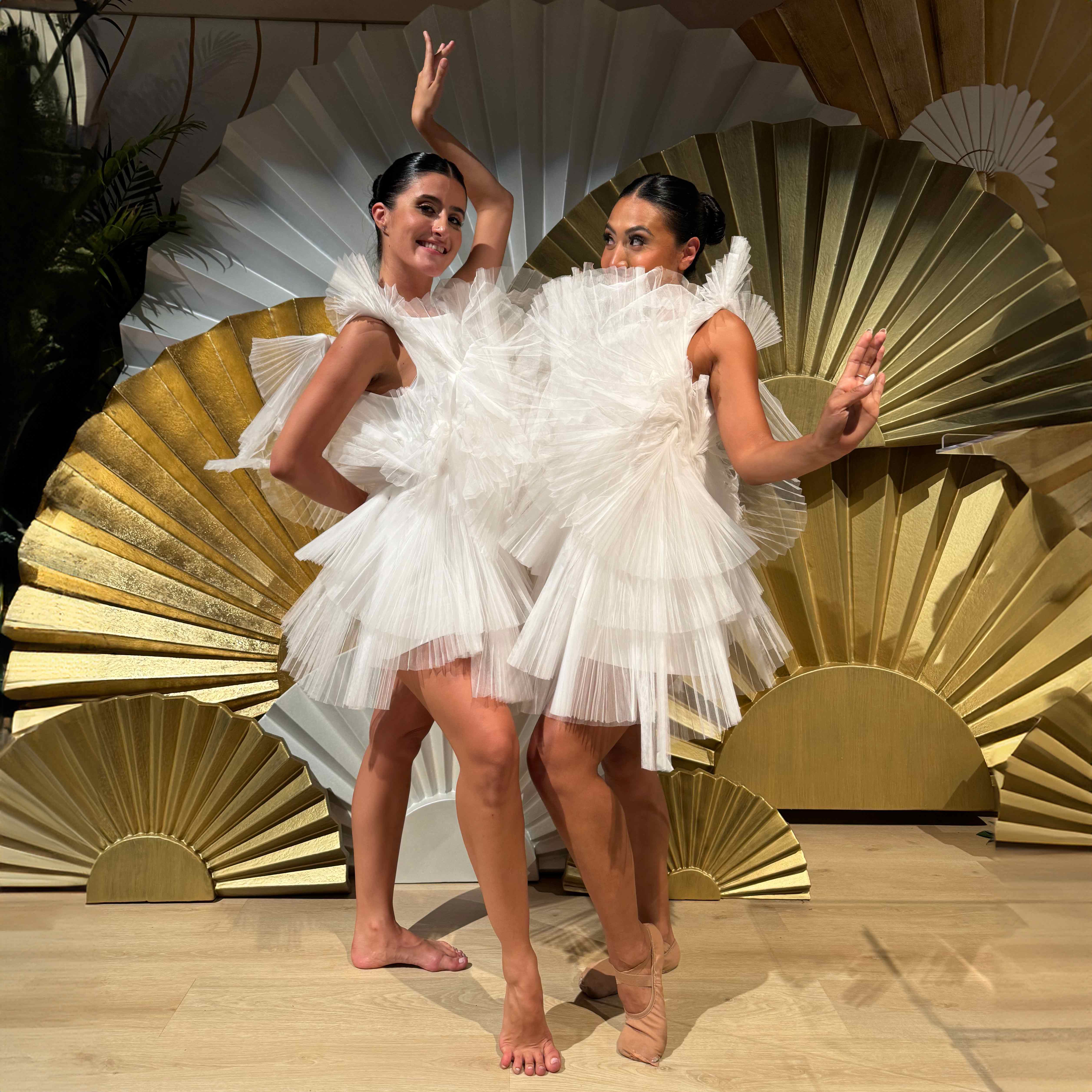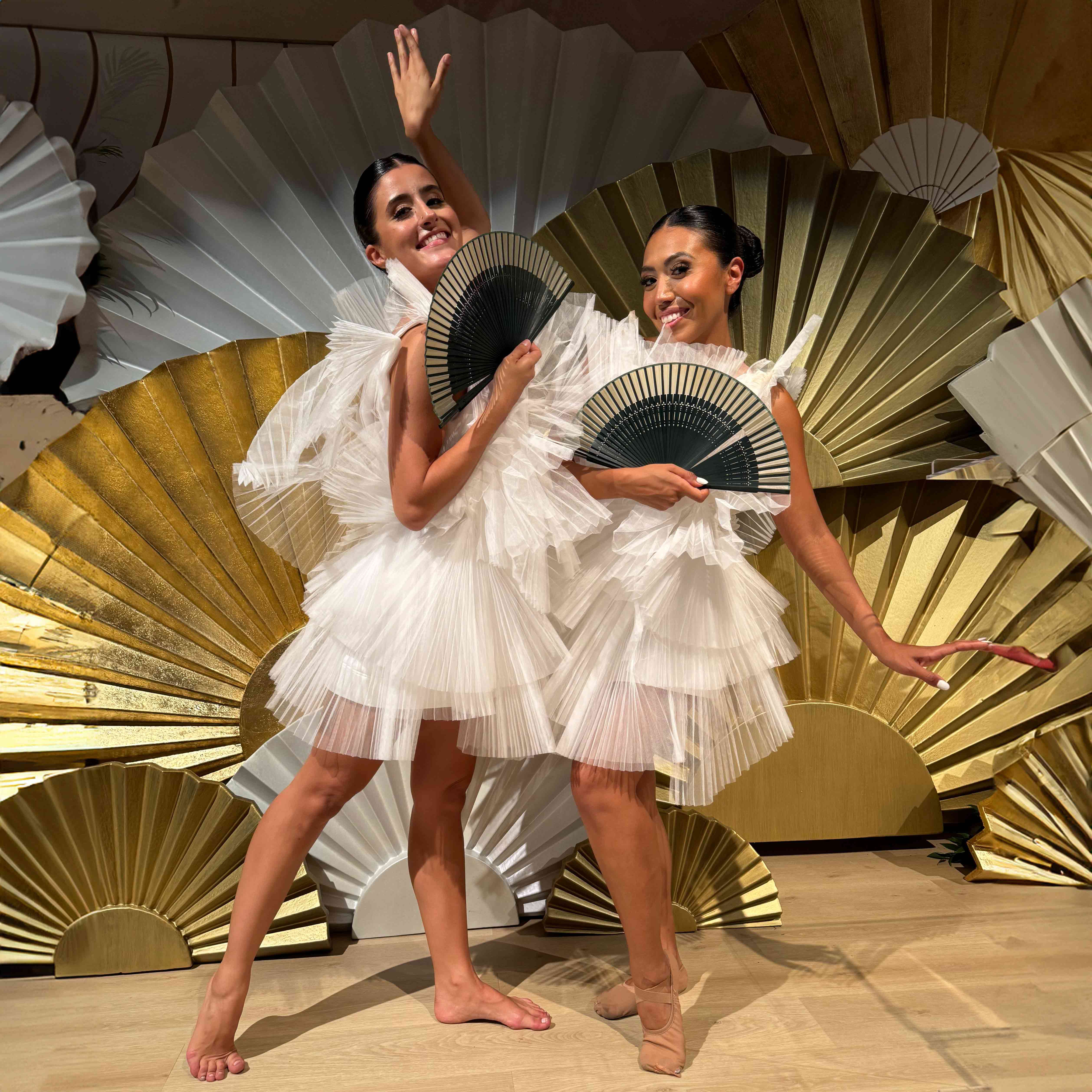 Featuring stunning white and gold fan dresses meticulously handcrafted to captivate your audience with a touch of luxury and sophistication