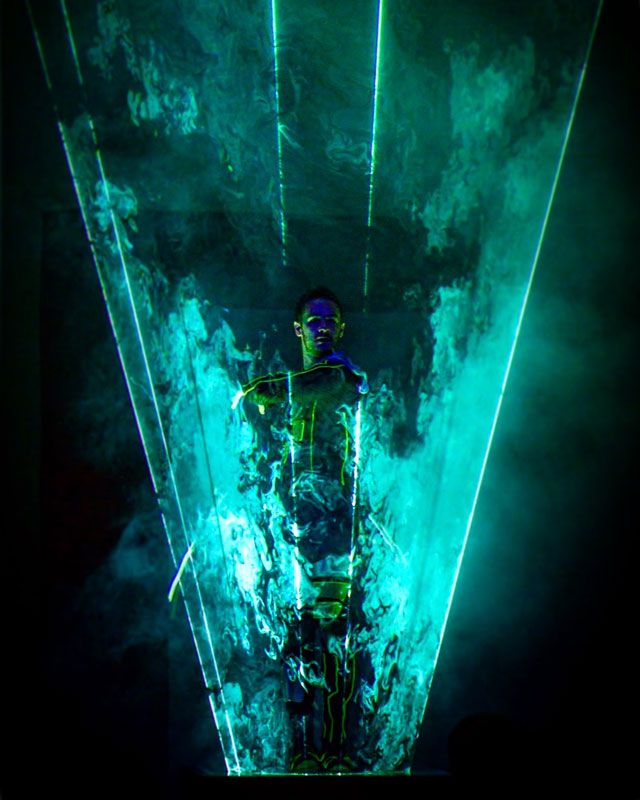Crafting a unique experience fusing art and technology, our Laserman constructs a virtual world made from laser beams, futuristic interfaces, plasma sparkles, and neuronal networks, taking audiences on a dynamic ride through a futuristic realm with a black hole finale.