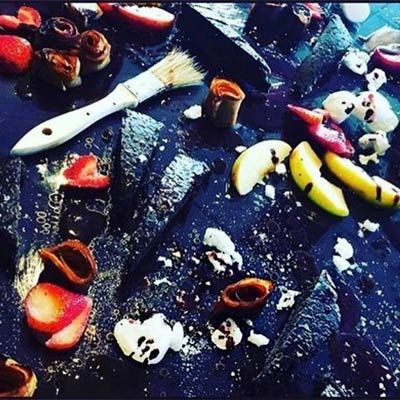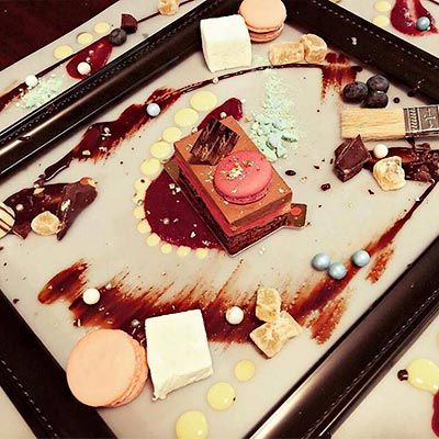 Indulge in a unique and live abstract dessert show including a variety of sauces and colorful delicious deserts