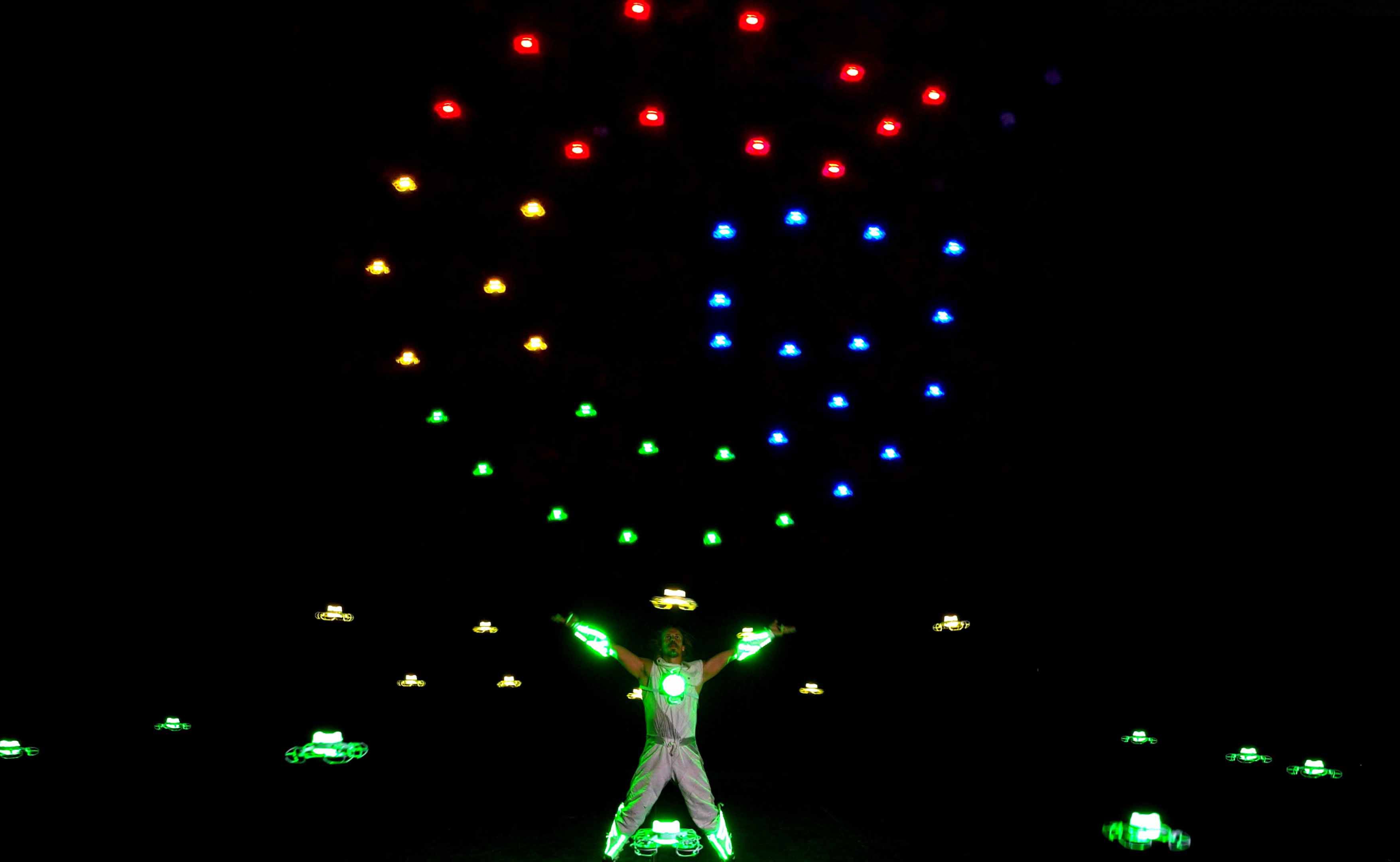 Our illuminated drone show can be customised to include various circus acts, props and costumes to fit Futuristic, Star Wars and other event themes