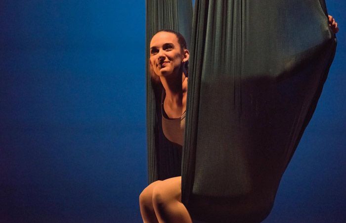 On top of her original apparatus combining trapeze and hammock, the artist offers beautiful Lyra, silks, aerial rope and trapeze routines
