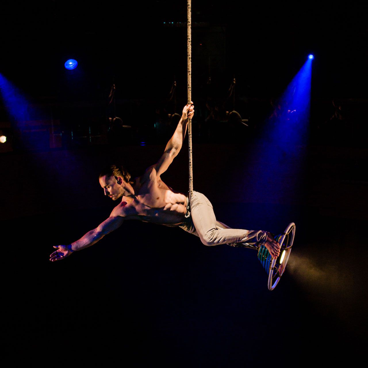 This male aerialist stuns audiences with dynamic performances that showcase intense strength, musicality and delightful choreography