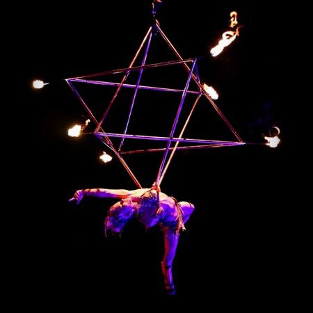 Our aerialist performs on a Merkaba, a unique aerial prop with attached fire spots for an epic pyro finale, that is also available without fire