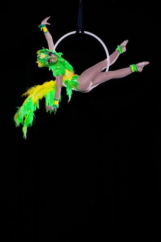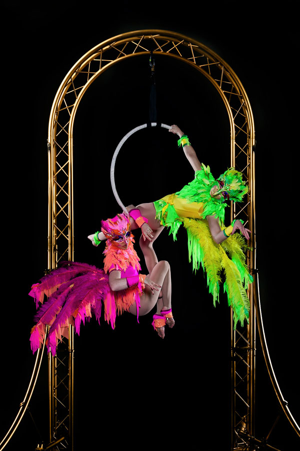 For the aerial performance two gloriously adorned bird-like creatures sit on a unique freestanding rig. Taking inspiration from the movements of birds and the Victoriana style they spin, twist and balance preciously on their perch giving an entrancing performance that culminates in an explosion of glitter. Alternatively, they can roam amongst your guests stirring up chatter and posing for photos.
