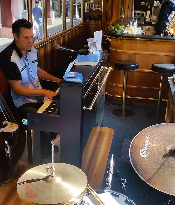 The boogie boogie solo pianist is also available to book as a trio alongside a drummer and double bass player.
