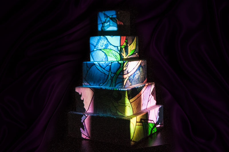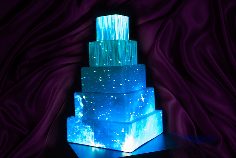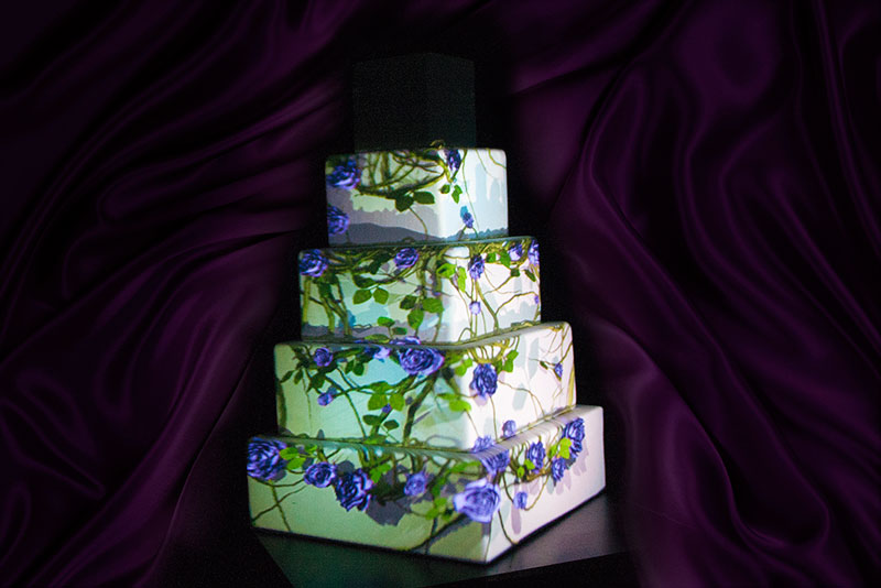Our team of video mapping experts is committed to work closely with you to create projections that fit your theme. Fully customised, each mapped wedding cake is exclusive and different. If you would like our team to tell your love or life story through visuals, they can include your photos and coordinate the projections with music of your choice.