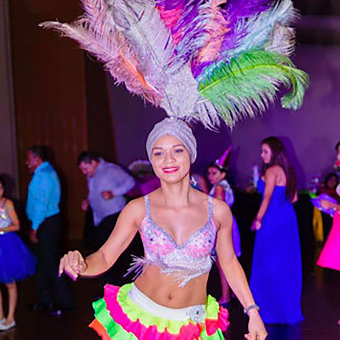The Caribbean Dance Band consists of high-energy dancers, musicians and upbeat percussionists, all dressed in vibrant costumes