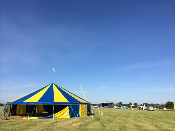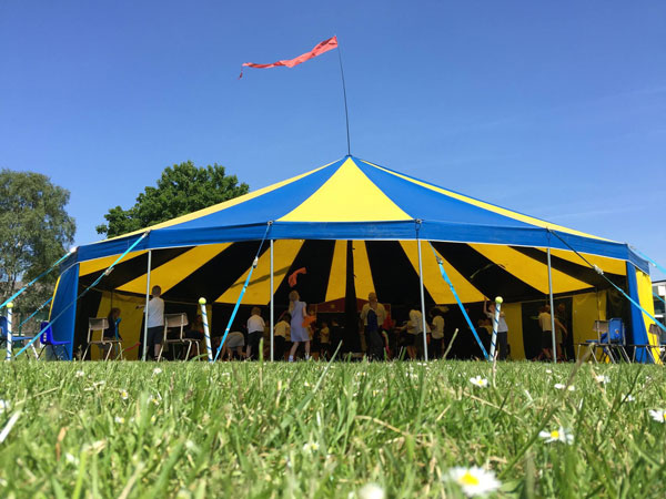 Whether you’re in need of an alternative wedding tent hire or circus tent hire for a festival, open air community event or corporate activities day our circus tents are the perfect choice. All a vibrant blue and yellow in colour they come in three sizes, 30 ft, 36 ft and 48 ft, the largest suitable for up to 230 guests. Providing a colourful source of shelter from the sun (or the rain) these tents for hire make a photogenic alternative to traditional white tents.