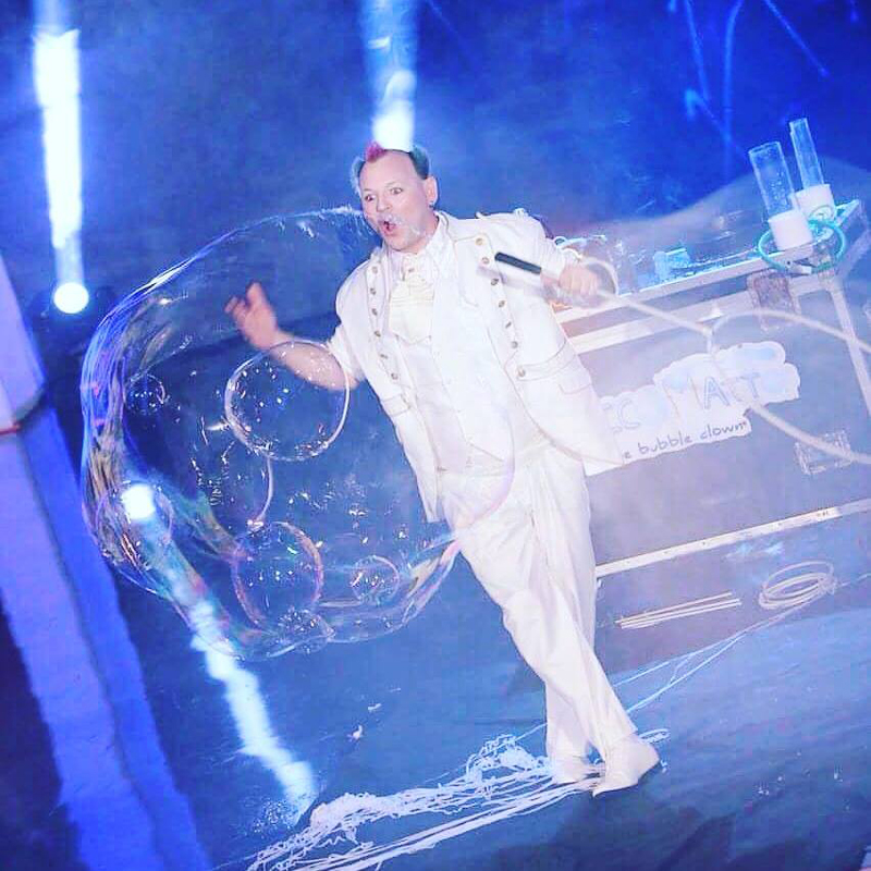 Combining clowning, mime, and comedy with world class bubble art, our artist will enthral and amuse audiences with his incredible tricks, creating giant bubbles, shaped bubbles, and coloured bubbles, and even putting guests inside of the bubbles for a truly spectacular show!