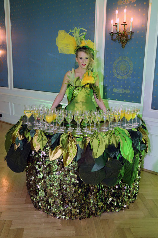 These roaming canapé tables have a comprehensive list of costumes they can wear to fit your event’s theme. From elegant black evening gowns to gorgeous white dresses, the variety of designs available can be the perfect option for a wide range of occasions. Additionally, our human living tables’ dresses can be the perfect compliment to your event’s décor.