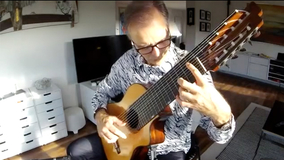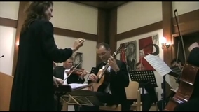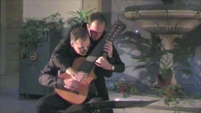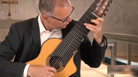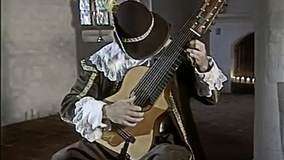 Musician plays both his six-stringed classical guitar and an eleven-stringed altoguitar (a popular instrument in the Renaissance and the Baroque)