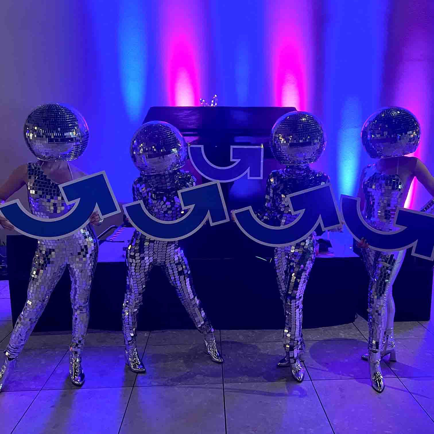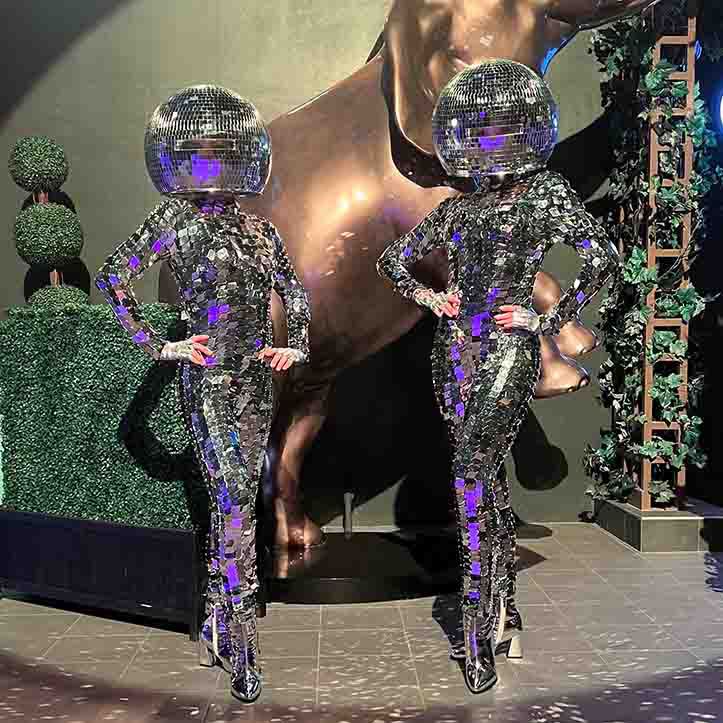 Dazzle guests with our Disco Ball Dancers, dressed up in sparkly attire and topped with an overstated disco ball head