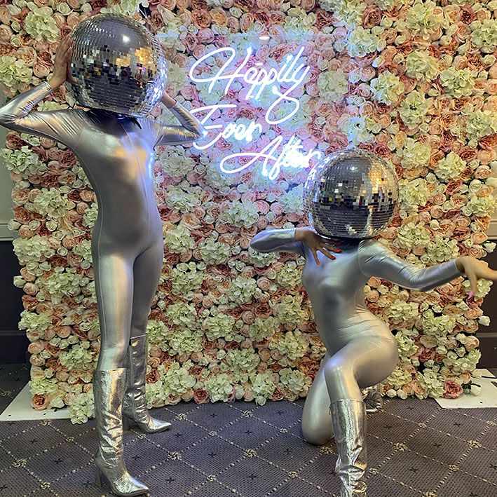 Hire giant mirror ball head hostesses who can pose for photos, interact with guests, and offer ambient dancing