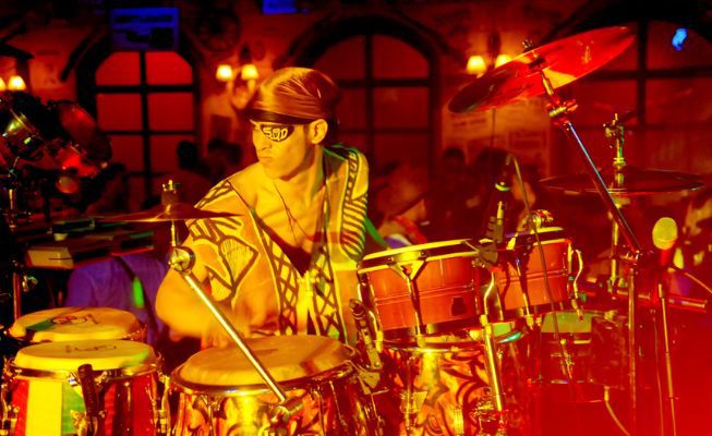 Explosive show format featuring live percussion, vocals, horns, trumpet, sax, guitar, DJ, dancers, original music, and immersive visuals