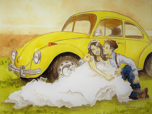 " When we have met [her], we had absolutely no thought of this kind of service and when we have seen her paintings we have been immediately delighted! She is very professional and very precise when she draws. When we received the wedding paint-book, the final result literally amazed us! She is a proud artist! We highly recommend her! "