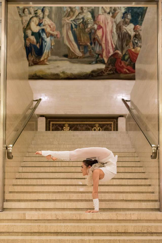 One of the very few contortionists able to perform the renowned Marinelli Bend, this circus act is among the most mesmerising movements that can be achieved by the human body! The Marinelli Bend is an extreme balance where all the weight of our contortionist’s body is taken on her jaws and neck, a pose that is guaranteed to get a reaction from audiences.