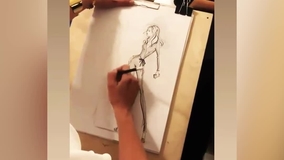 From Marie Antoinette gowns to haute couture styles and beachwear scenes, she sketches guests as fashionable cartoon caricatures with flair