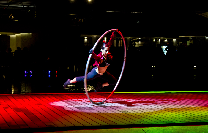 The cyr wheel performer is a very tailorable circus entertainment option. Requiring nothing but a little floor space she can amaze audiences with her show. The LED cyr wheel is a fantastic show for night time events and something many guests will have never seen before.