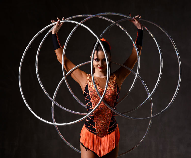 Perfect for themed events, she can also showcase her hula hoop skills on cruise ships, at brand activations, or as part of a larger circus production.