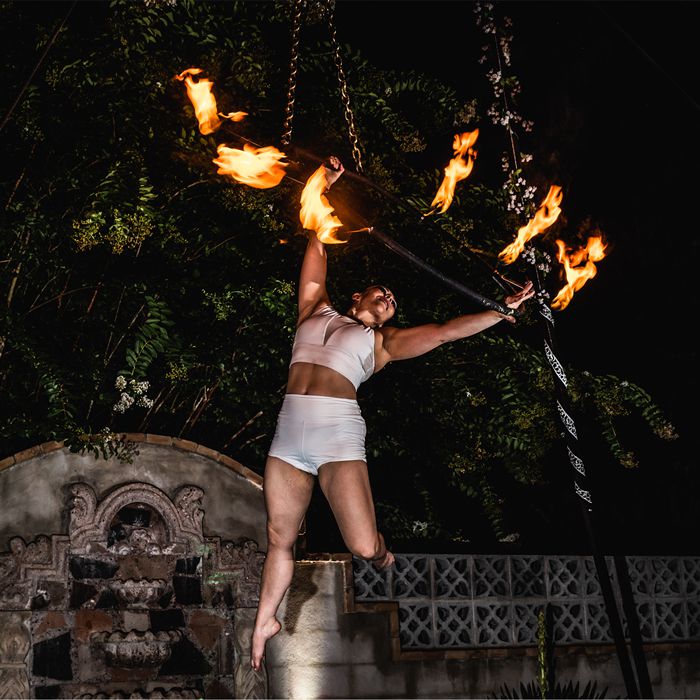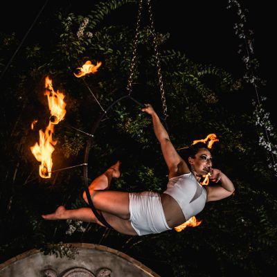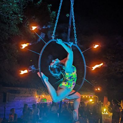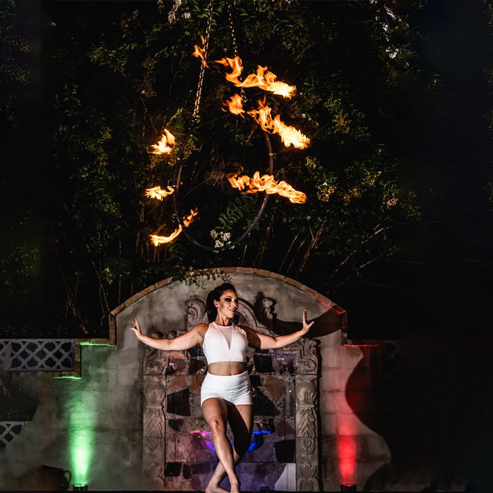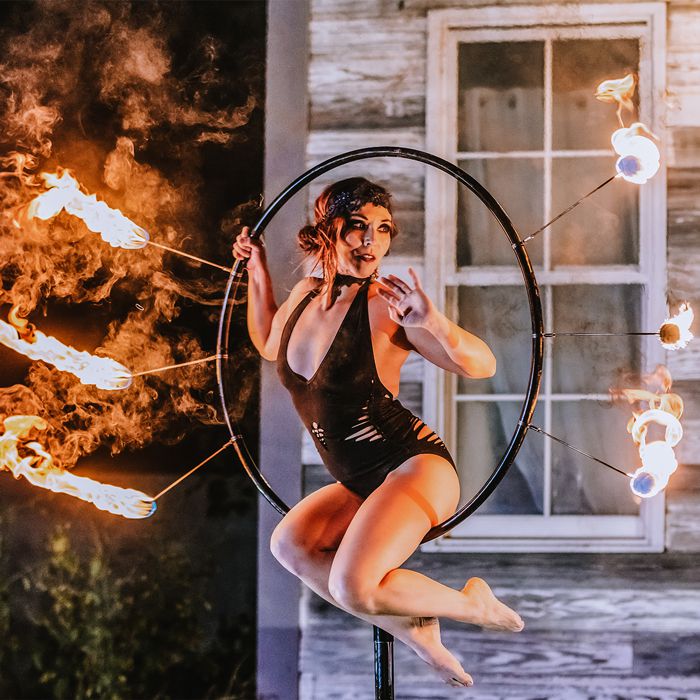 Our fire hoop aerialist is one of the first aerialists in Texas to present her fire Lyra on professional stages