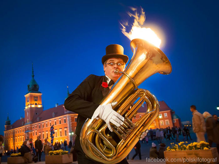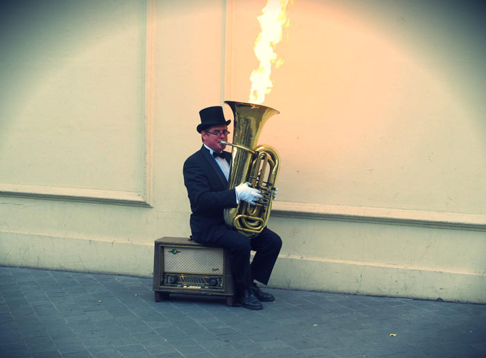 Our Flaming Tuba Gentleman is a vintage musician both in appearance and in personality, he likes nothing more than putting a smile on people’s faces with his unique act. Originally from Poland, he has been busking and performing at events all over Europe from Warsaw to Berlin, Prague to Vienna. Now based in London he is available for welcoming performances, weddings, receptions, vintage fairs, and any event that requires a unique act as a focal point.