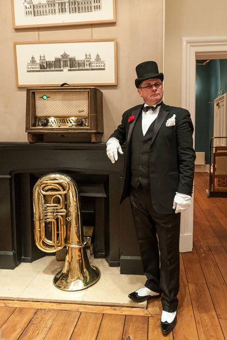 Perched upon his retro wireless radio, the Flaming Tuba Gentleman plays along to old-fashioned 1920s to wartime-era Jazz and swing tunes. He has a vast repertoire of songs that will keep your guests entertained for a long time. As the vintage musician plays his magnificent brass instrument, he billows out puffy flames which as just simply mesmerising.