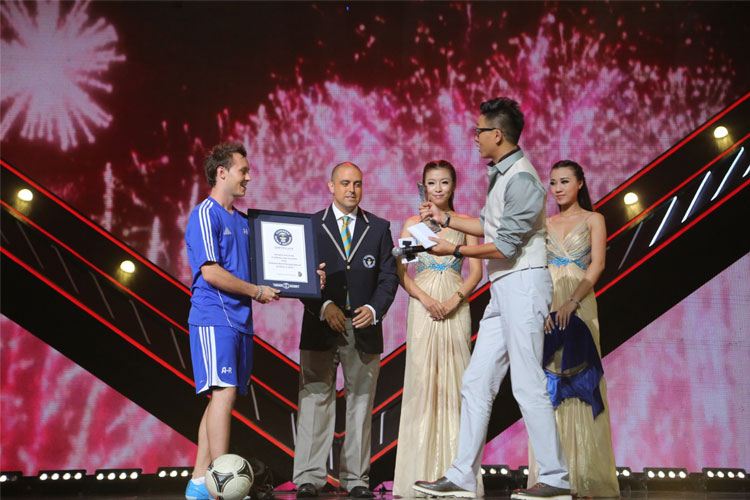 To add to his extensive media work our sports entertainer was flown out to Beijing to appear on the Guinness World Records China Special TV show Zhen Da Zong Yi. Over 50 million people across China tuned into the show and witnessed Ash break one of his own Guinness World Records live on TV.