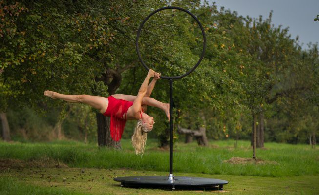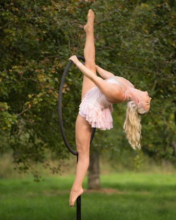 This stunning aerialist delivers graceful and dynamic dance performances on a freestanding hoop, bringing a touch of elegance to your event